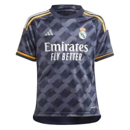 Official Real Madrid 23/24 away shirt for juniors, featuring AEROREADY moisture-wicking fabric for lightweight, breathable comfort. Finished with embroidered club crest and signature Adidas branding for authentic on-pitch look and strong retail appeal.